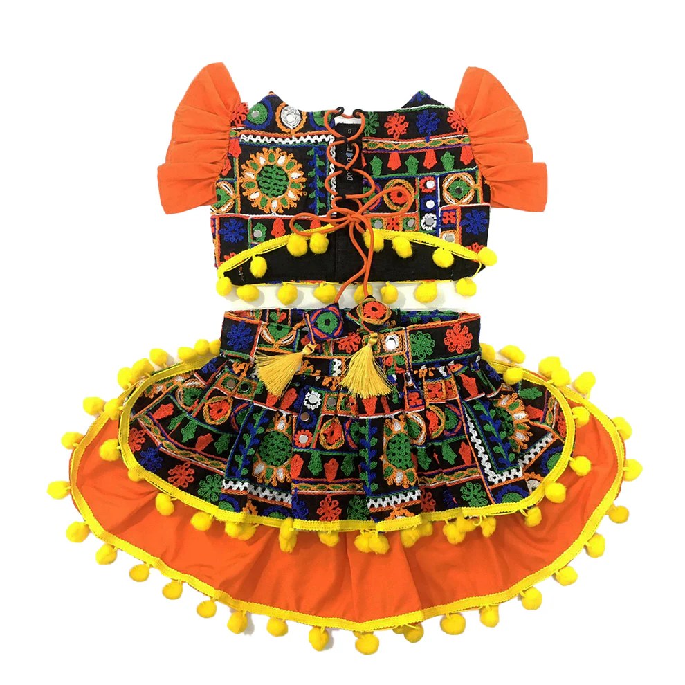 A vibrant black and orange embroidered ruffle lehenga choli designed to make your little star shine. Featuring intricate threadwork and playful ruffles, this lightweight festive outfit is perfect for celebrations and special moments.